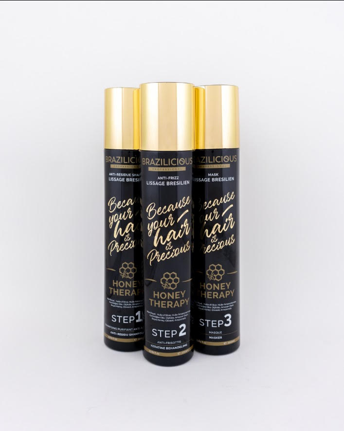 - Stap 2 Brazilicious Honey Therapy aanbrengen haarlok per haarlok. Heel weinig De keratine moet aan 1,5 cm van de hoofdhuid aangebracht worden en het product mag niet in aanraking komen met de huid/hoofdhuid. Het is zeer belangrijk om zo weining mogelijk keratine aan te brengen. Het is helemaal geen kleuring. Indien er teveel keratine wordt aangebracht kan het haar achteraf vettig worden.